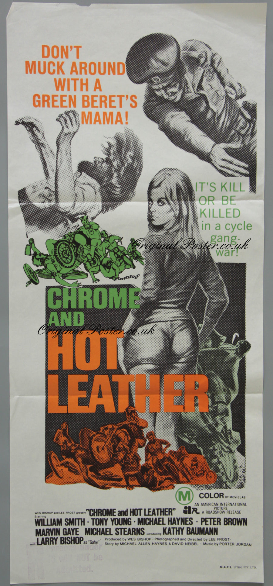This is one of those really wild exploitation film posters from 1971 which would never be allowed today and is now popular. Litho printed by MAPS in Australia this one was purchased by us directly from a New Zealand cinema and despite the threats on the poster this one has escaped to be a survivor in good condition with just two horizontal fold lines and no pinholes. Clearly this one has never been in the possession of the Hell's Angles.