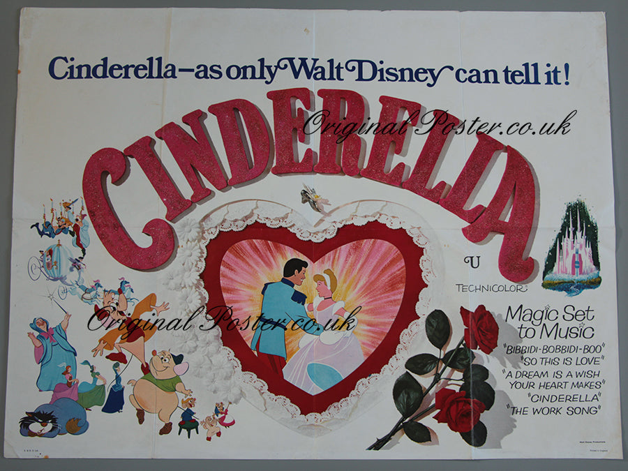 Lovely fairytale "Cinderella" Walt Disney film poster picturing the magic castle, the coach and horses and of course the happy couple. Folded condition as issued to the cinema. This film poster displays well and came from the Lynton cinema in Devon. Just a couple of minor marks on this 60's re-release cinema poster as seen.