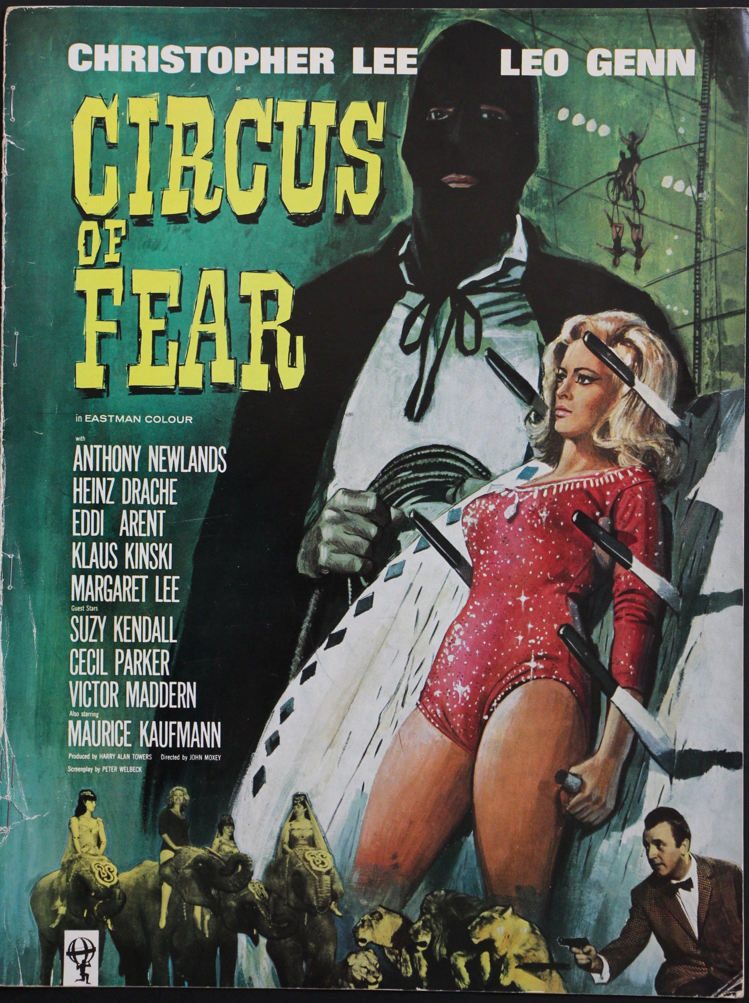 This glorious ten page campaign booklet is the only way we know of to get the full colour artwork on the film 'Circus of Fear'. The interesting book is produced by Anglo-Amalgamted and printed in England by H. E. Simpson ltd. The press features include a naked photo of Suzy Kendall with details of the pale yellow E-type Jaguar sports car given to her by admirer Dudley Moore. The car was parked just a few feet from her home in South London and was stolen two weeks after she received it. The other robbery mentioned was the one staged for this film 'Circus of Fear' by Tower Bridge with a waiting speed boat and three burly things with stockings over their heads. Other pages detail pictures of American and British posters, press ads and other features.