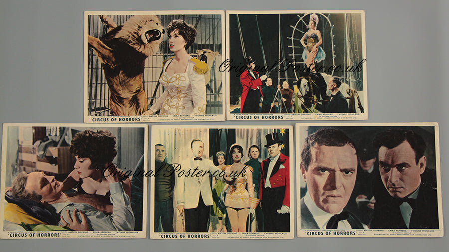 Super X certificate 1960 British front of house cinema lobby cards for "Circus of Horrors". Anton Diffring is pictured as the incompetent plastic surgeon taking refuge in Donald Pleasance's big top. These full colour cards capture the circus setting of this British horror film from Anglo-Amalgamated film distributors ltd.