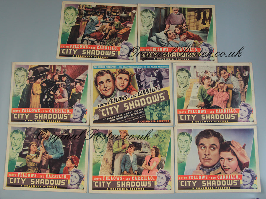 This 1938 set of eight front of house cinema lobby cards have a quaint photo of the busy shops and cars on the sidewalks of New York. Pictured is the pawn shop, the confectioners, dry goods shop and a very busy street scene. This "City Shadows" film was also known as "City Streets" released by Columbia Pictures of New York in 1938. The film was released the year before the advent of the Second World War when all seemed fine in New York and we can see busy city life and an interesting General Store scene.
