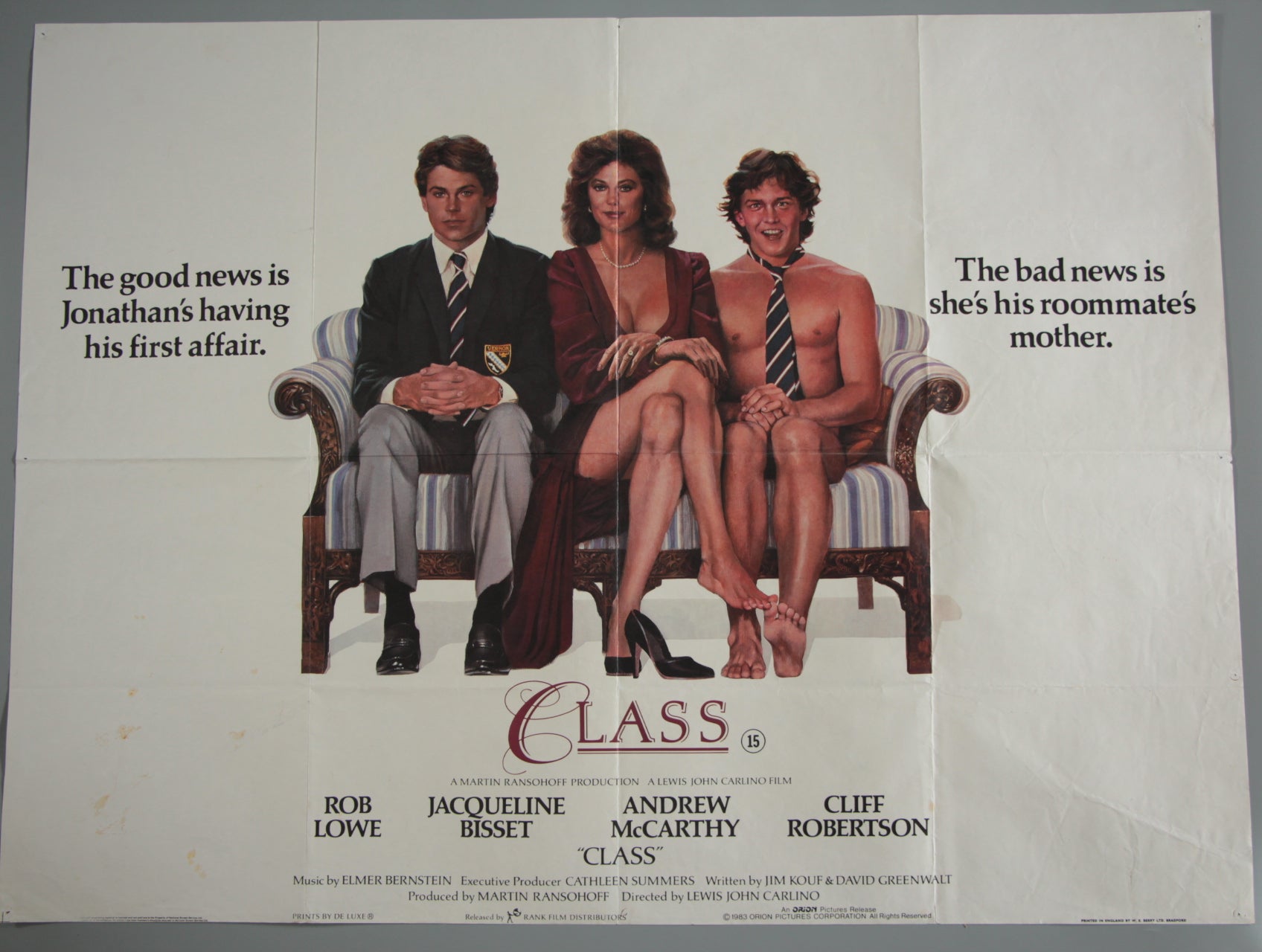 This is the original 1983 British quad film poster for the comedy film "Class"picturing Jacqueline Bisset, Rob Lowe and Andrew McCarthy. Printed in England by W. E> Berry of Bradford the film poster has some marks as seen at the lower left with a few pinholes in each corner.