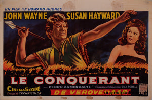 Howard Hughes CinemaScope poster picturing John Wayne as Genghis Khan with Susan Hayward as his lover. Postmark stamp at bottom right.