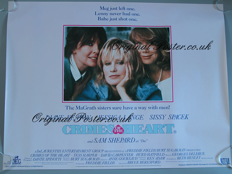 Great rolled condition British quad film poster from 1986 with a lovely photo of the MaGrath sisters played by Diane Keaton, Jessica Lange and Sissy Spacek. Beth Henley adapts her own Pulitzer prize-winning play with the three sisters coming together after Babe MaGrath played by Sissy Spacek is released from prison. Great critically acclaimed film.