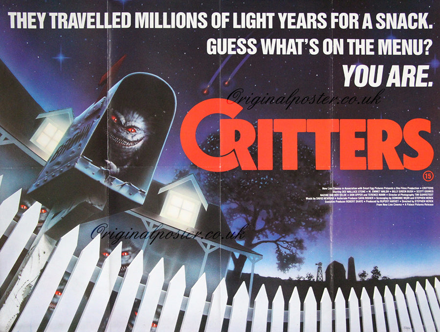 Stephen Herek directs an entertaining horror/comedy with nasty hedgehog like alien creatures who invade an American town, looking for lunch. The tag line on the poster says it all - this popular film was tongue in cheek and inspired by "Gremlins". Features the artists printed signature.