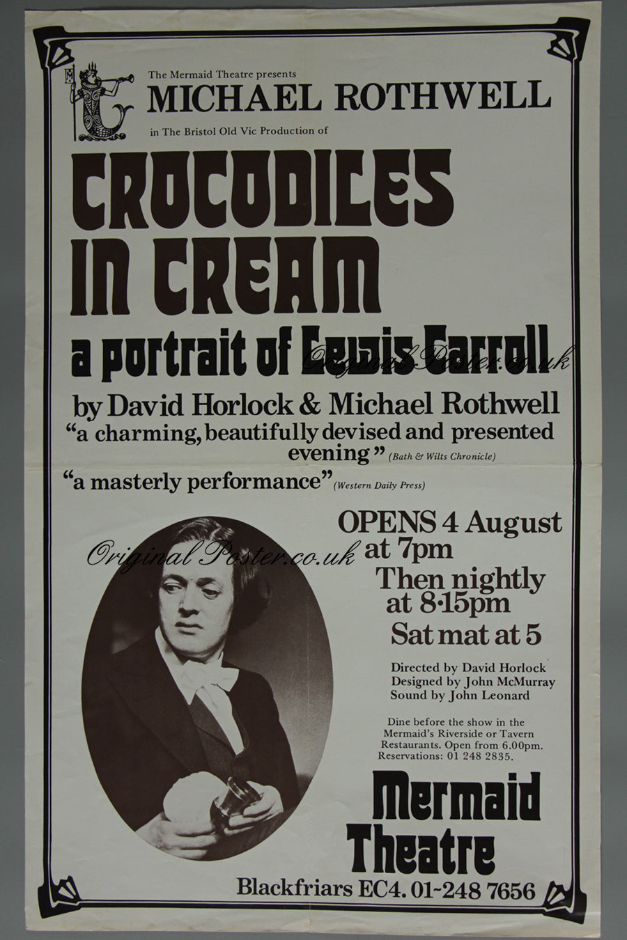 Rolled condition original theatre playbill for "Crocodiles in Cream A Portrait of Lewis Carroll". This play was performed at the Mermaid Theatre in Blackfriars London in 1975 / 1976.