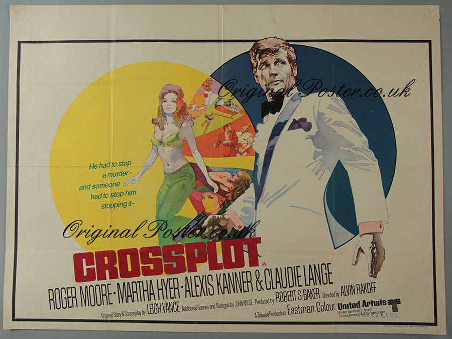 Roger Moore looks very suave with his white tuxedo and ruffle shirt as painted by the great Italian artist Arnaldo Putzu. At the time Roger Moore was an extremely popular TV star with successes in "The Saint" and "The Persuaders". He was yet to become cast as James Bond. The plot for the film casts Roger Moore as an advertising executive looking for an ideal girl for a campaign. In "Crossplot" the artwork here is very Swinging Sixties with great colours making for an action packed thriller poster with great strong colours and a brilliant expression on the face of Roger Moore. Printed in England by W. E. Berry of Bradford. The poster has a small blue felt bleed just above the printers name from where the title has been written on the reverse and we have attached three very small areas of conservation tape at the top border and at the right centre cross fold with a small 1 inch closed tear being visible at the bottom centre border. four or five pinholes to each corner.
