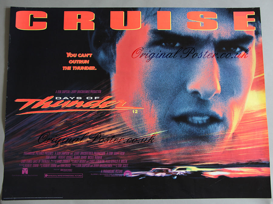This rolled condition quad film poster for "Days of Thunder" features a stylistic portrait of Tom Cruise complete with racing cars in a wash of impressive colours.