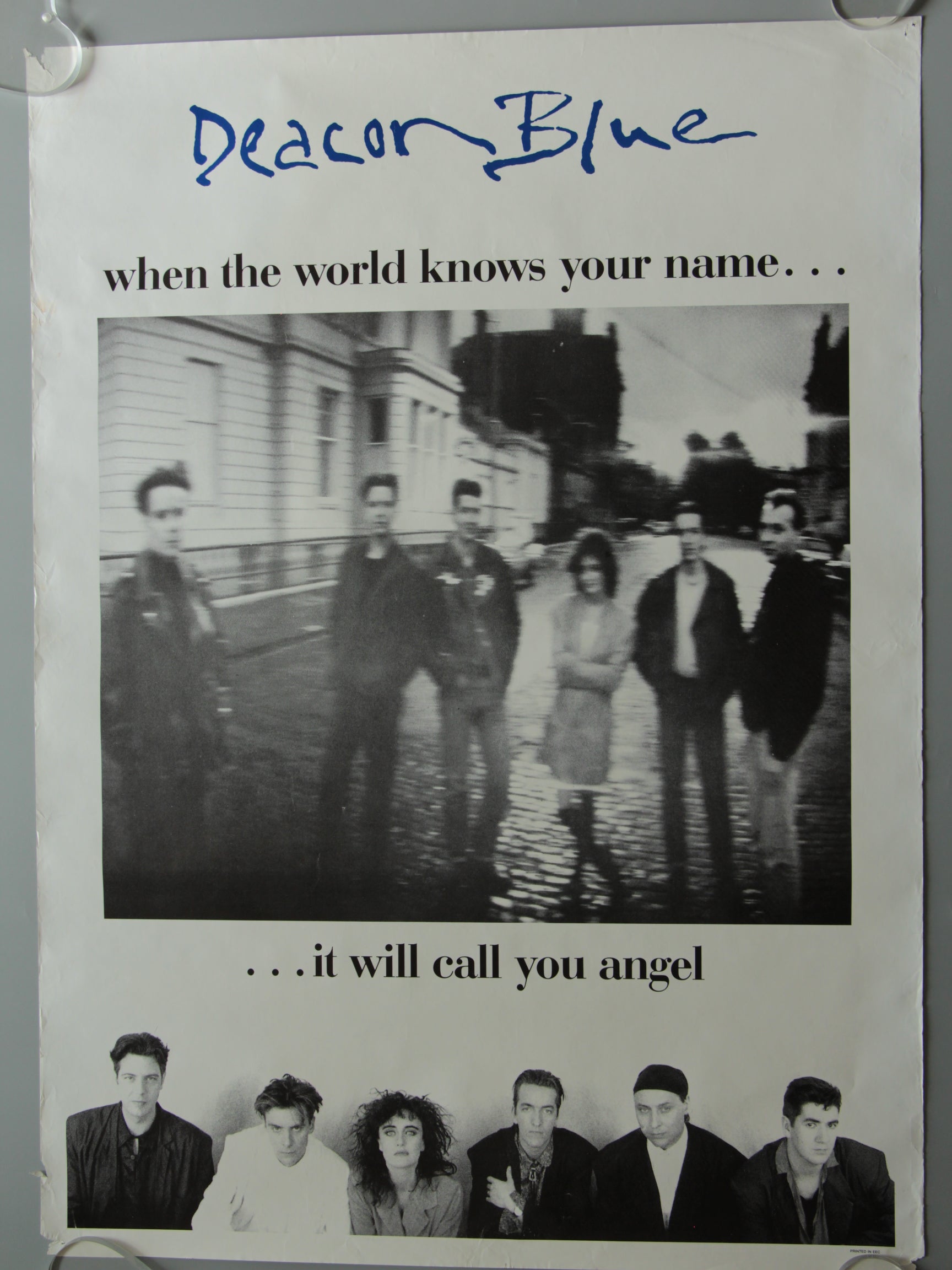 Rolled condition Deacon Blue music poster with portraits of the six band members at the foot plus a large central photo and the band name in blue typography as the header. Pinholes in the corners and slight paper loss at the corners.
