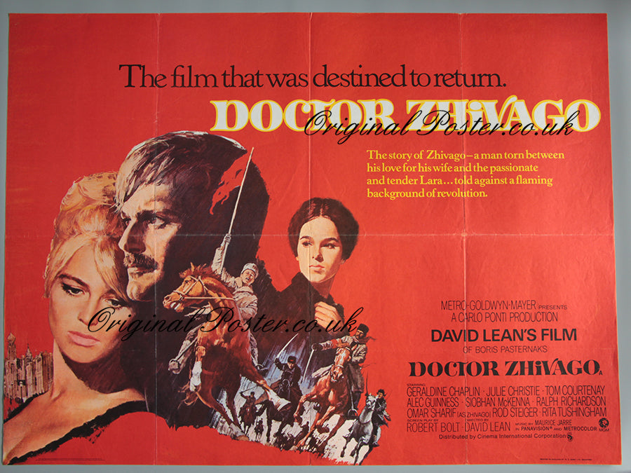 David Lean directs meticulously. Pictured are Omar Sharif and Julie Christie who share a passionate romance set against the backdrop of the Russian revolution. Freddie Young adds the Cinematography in this all-star MGM classic. This is a re-release poster for the first return of this popular classic. Printed in England by W. E. Berry Ltd of Bradford. This folded film poster has bright colours with no pinholes.