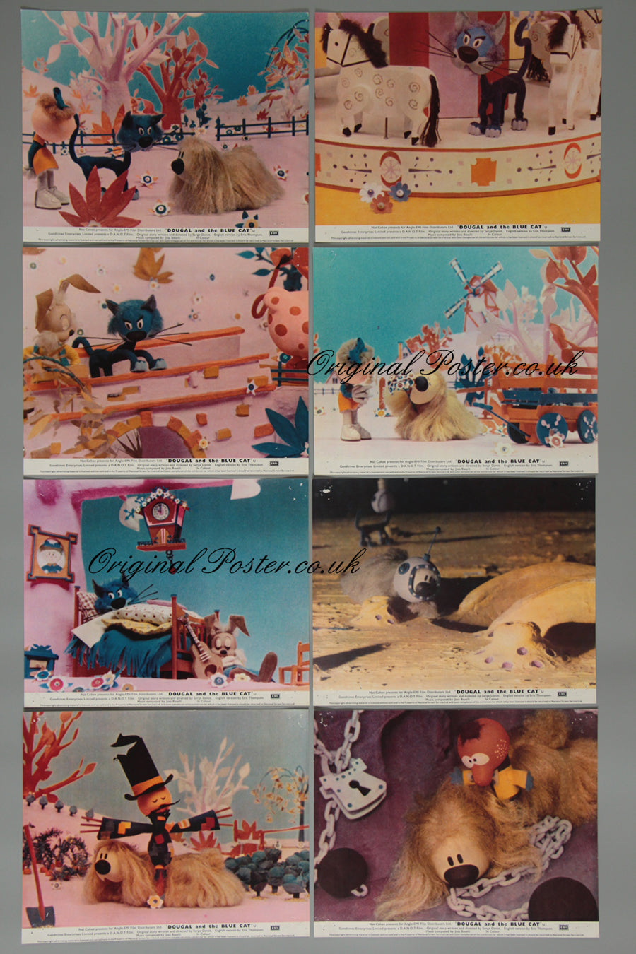 Full set of 8 front of house cinema lobby cards for "Dougal and the Blue Cat". Directly purchased from a cinema in Auckland these cards even include a brown stamped return slip. Great colours from a cult film.
