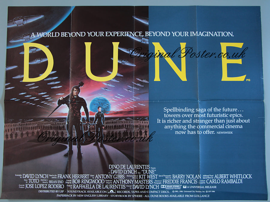 "Dune" style 'B' British Quad film poster from 1984. Amazing science fiction film and a great film poster picturing the planet where "spice" is the quest for two waring families as the melange is beneficial for expanding the mind. Director David Lynch explores a new world of science fiction in a different way in this ground breaking film. The colours are really deep on this 1984 British quad film poster. Just two small closed tears at the right border (one is 1 inch and the other 1/2 inch) we have repaired the tears with restoration tape to the reverse.