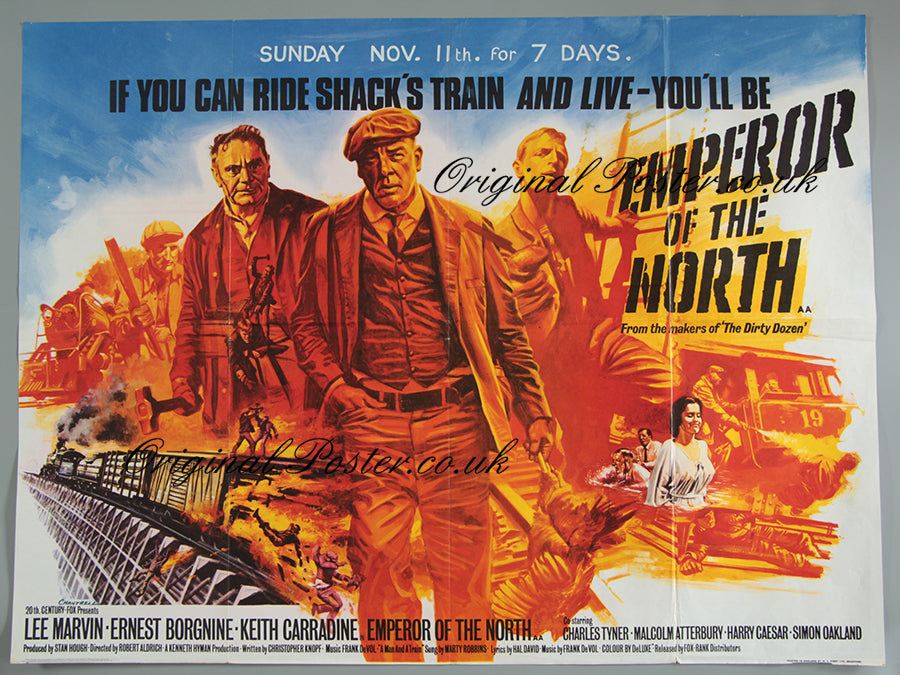 This 1973 film poster tells the story of "Emperor of the North" a part played by Ernest Borgnine as the railway guard who makes it his business to make sure that no one rides the train for free! This is just the type of challenge that Lee Marvin relishes and the battle commences as pictured. British artist Tom Chantrell has his printed signature at the lower left with the poster printed in England by W.E. Berry of Bradford. The cinema manager must be commanded for a very neat showtime presentation at the top on what is a highly coloured and detailed film poster with no pinholes just a few little nicks in the border as seen.