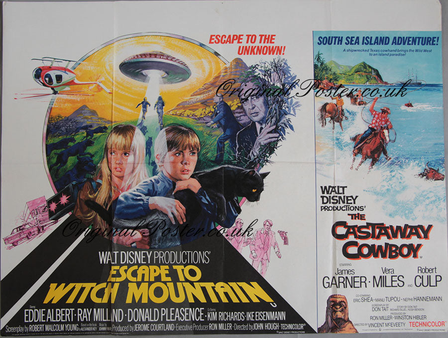 Walt Disney film poster with super flying saucer artwork and with Ray Milland starring as the villain seeking to use the clairvoyant powers of the two youngsters for his own devious plan. The poster art features a black cat and a host of dobermans with the benefit of great Texas cowhand artwork for the support film. Printed in England by Lonsdale & Bartholomew.