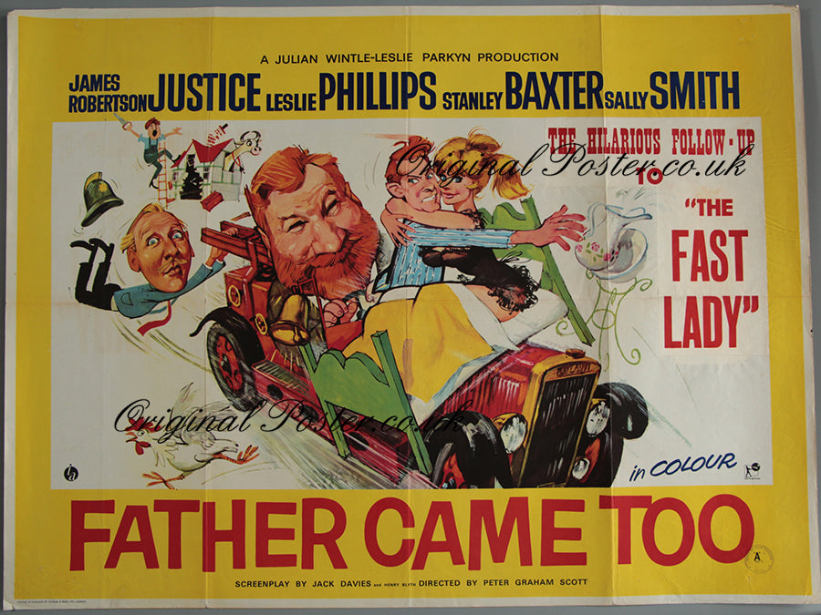 Terrific Sixties artwork with magnificent paintings of James Robertson Justice, Leslie Phillips, Sally Smith and Stanley Baxter having fun with the Leyland fire engine. Charles & Read Ltd. of London are the printers. This British film poster has a Maltese censor stamp over the "A" certificate next to the title. Felt bleed from reverse on Leslie Phillips' legs and a printed snipe to the right referring to "The Fast Lady". Pinholes in corners.