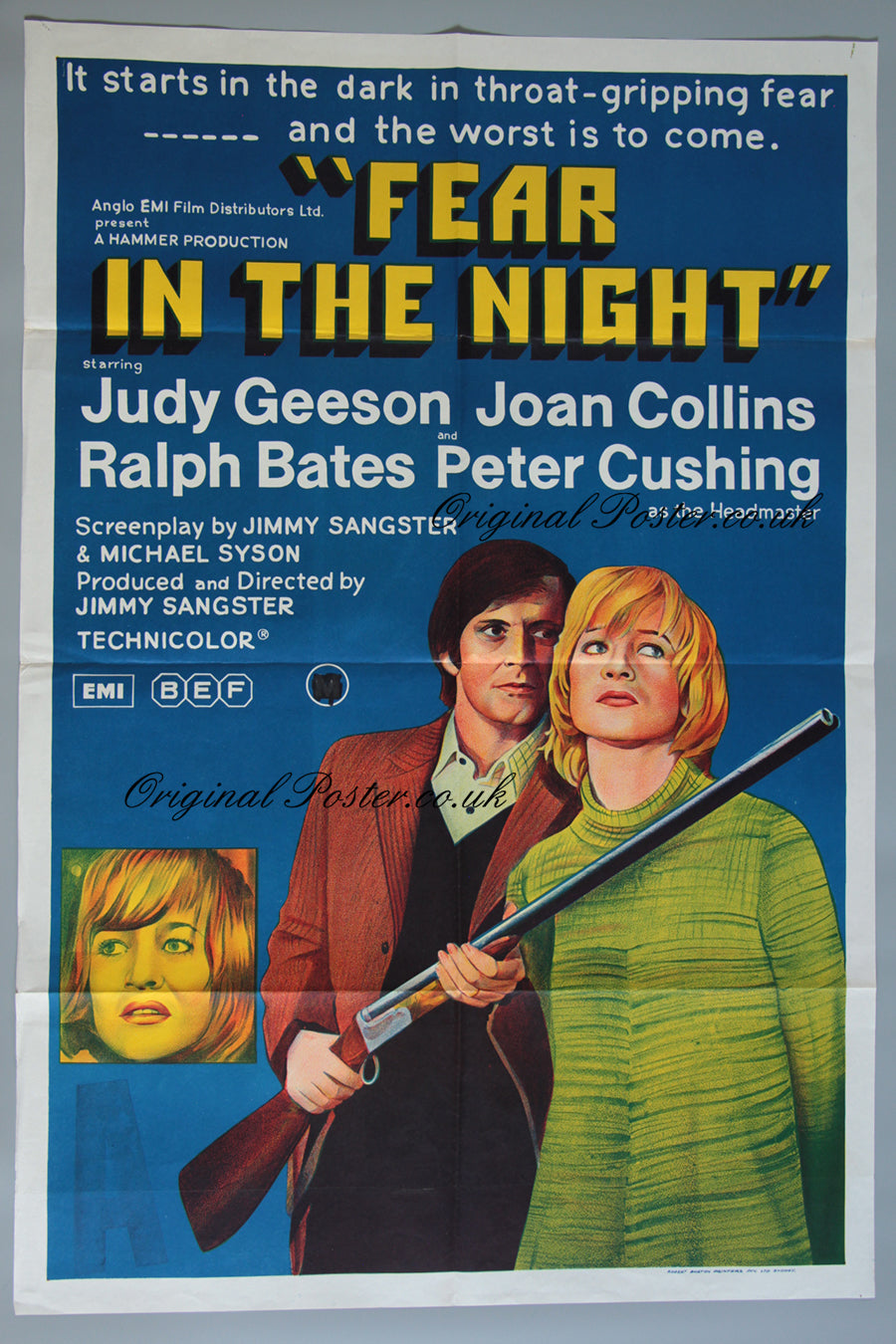 Amazing Hammer Production film poster from 1972 for the psychological horror film "Fear in the Night". The colours on this stone litho printed poster are really deep and picture the fearful looking Judy Geeson together with Ralph Bates. This is a school horror with Peter Cushing cast as the demented headmaster complete with an artificial arm. Joan Collins adds malevolence. Printed by Robert Burton Printers of Sydney this one has no pinholes and was purchased directly by us from a New Zealand cinema with the manager having neatly delete out the certification.