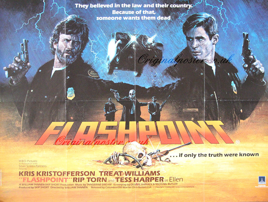 Kris Kristofferson and Treat Williams are pictured as US border patrolmen together with a buried jeep, a skeleton and a stash of money which they find in the desert. This leads to problems. Music by Tangerine Dream and impressive artwork on this Thorn EMI British quad film poster in folded condition as issued to the cinema.