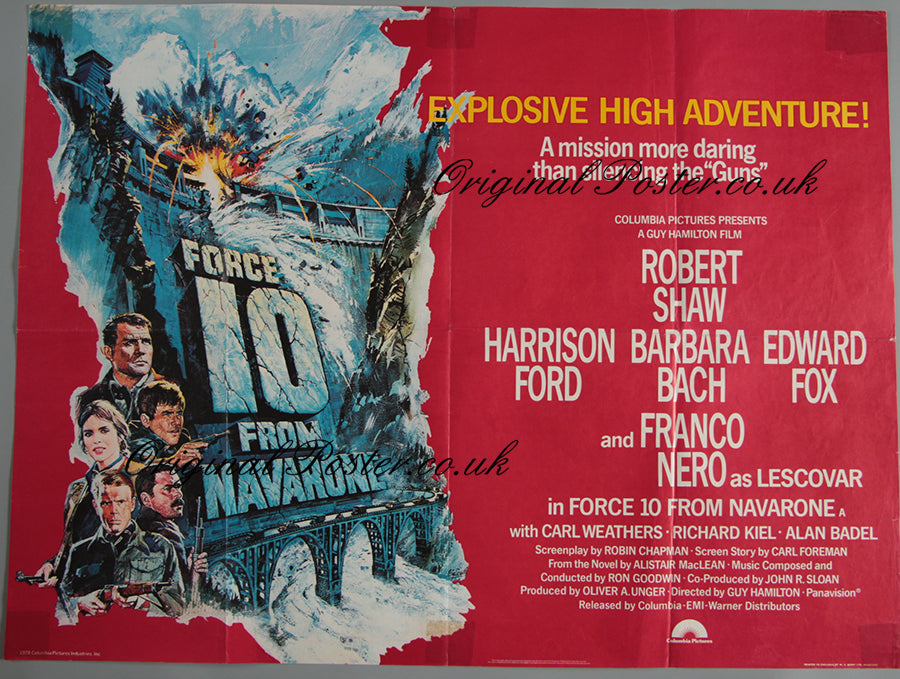 Explosive World War II artwork from the British artist Brian Bysouth and featuring his printed signature by the bridge at the foot of the artwork for "Force 10 from Navarone". Sequel to "The Guns of Navarone" from the novel by Alistair MacLean. Guy Hamilton directs. This British quad film poster was printed in England by W. E. Berry of Bradford. The poster displays well but does have six square tape marks to the reverse which show through to the front.