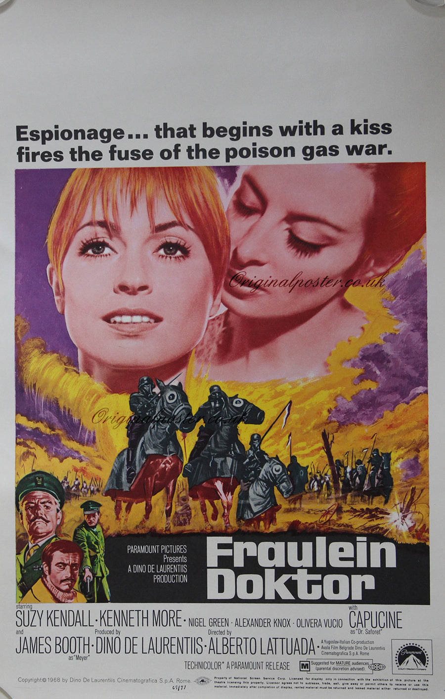Rolled condition window card from the year 1968 telling the story of a real life double agent played by Suzy Kendall as the "Fraulein Doktor". Litho printed in 1969 by Amalgamated lithographers of New York.