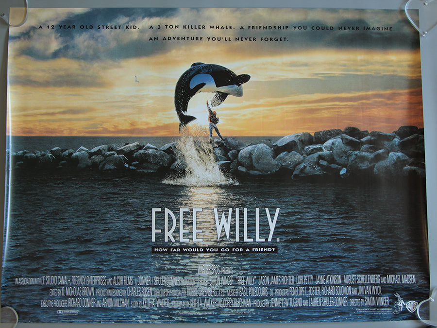 Great wildlife adventure about a boy and his whale. Willy (Keiko) the Killer Whale leaps over Jesse on this film poster from 1993 in rolled condition as supplied to the cinema and with no pinholes.