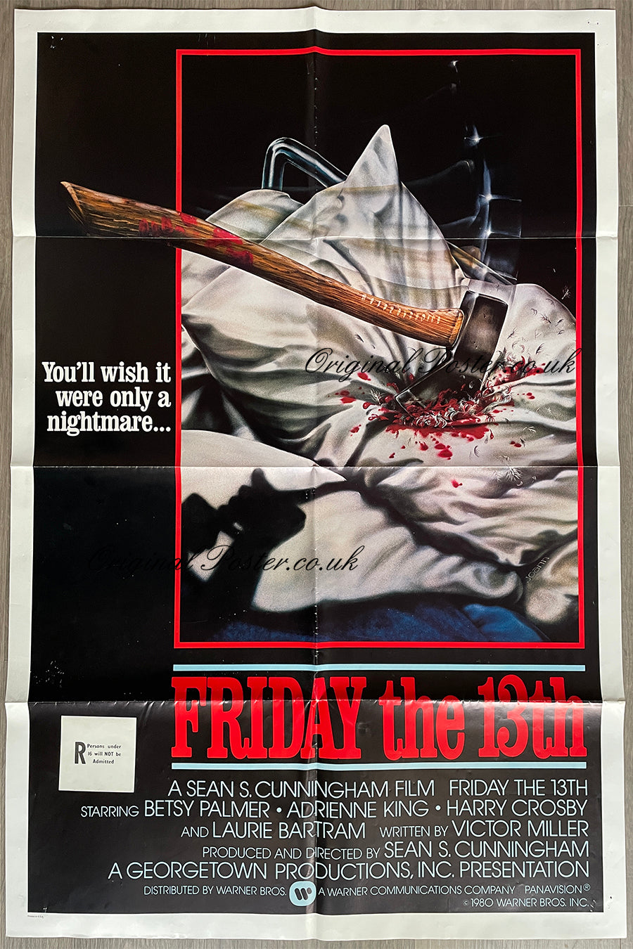 First release International one sheet film poster for "Friday the 13th". Printed in the USA for use in International countries this film poster came direct to us from a lady cinema owner in New Zealand and it has the benefit of an 'R' certificate ratings sticker at the lower left. The printed signature of the artist 'Joann' appears on the pillow as does the axe wielded by the unknown assailant. Kevin Bacon appears before he became famous and Camp Crystal Lake appears as a tourist venue not for the feint hearted. Folded condition with pinholes in the corners.