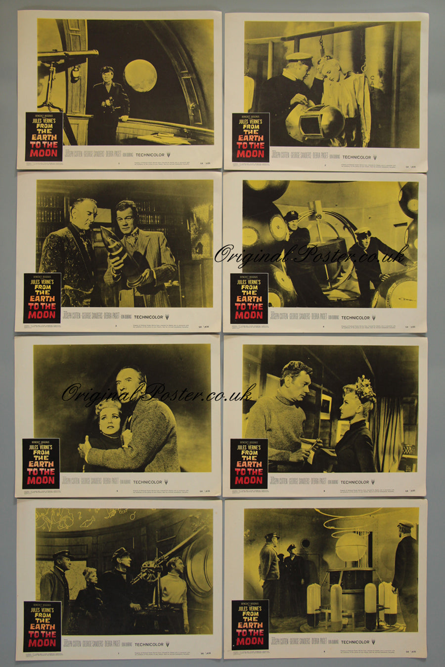Eight superb 1958 front of house cinema lobby cards produced by RKO Pictures to promote the film from the novel by Jules Verne "From the Earth to the Moon". These cards also include the fragile brown stamped envelope in which they were sent to the cinema. Fascinating science fiction type apparatus pictured.