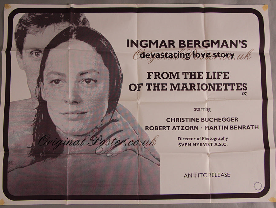 This 1980 British quad film poster is for the X certificate film made by Ingmar Bergman and shot mostly in black and white made during his tax exile in Germany. Not many of these were printed and who knows how many survived. Tape marks in the corners.
