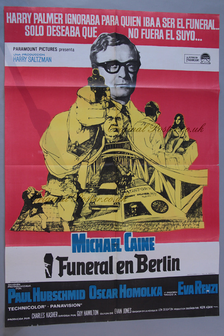 Following the success of "The Ipcress File" Michael Caine is Detective Harry Palmer in the 1966 film from Paramount Pictures "Funeral in Berlin." from Bond director Guy Hamilton. This first release Spanish poster was printed in Barcelona and features classy pen & ink artwork. The interesting artwork makes Harry Palmer the centre of attention as the gun points towards us and the supporting graphics feature love interest, intrigue, shady figures with guns, the car, the passport and alongside the title a coffin with the silhouette of a high heeled lady with automatic gun. A classy poster. Little closed splits in the fold lines.