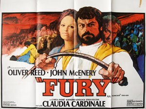 This 1973 British quad film poster pictures Oliver Reed, Claudia Cardinale and John McEnery in the Rank organisation film "Fury". The film poster boats "Technicolor" and "TODD-AO35" and was printed in England by W. E. Berry of Bradford. Please note there are tape marks at the top and bottom border of the poster.