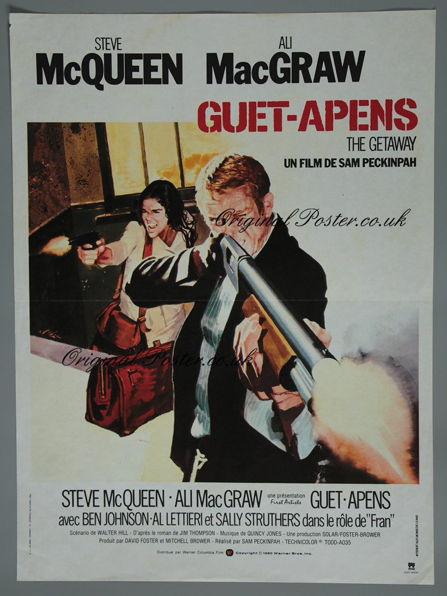 This is the re-release artwork that graces the Putzu UK Quad. This is the preferred art by many on the title although appearing seven years later it reflects the Peckinpah influence and depicts an older McQueen yet retaining the plank effect typography of the first release art. Printed by S. E. Lalande - Courbet 91 - Wissous. Central horizontal fold line with no fading or pinholes - just some marks on the reverse of the top half of the poster which show very faintly on the creamy white section underneath the Peckinpah wording. The film poster displays well despite this.