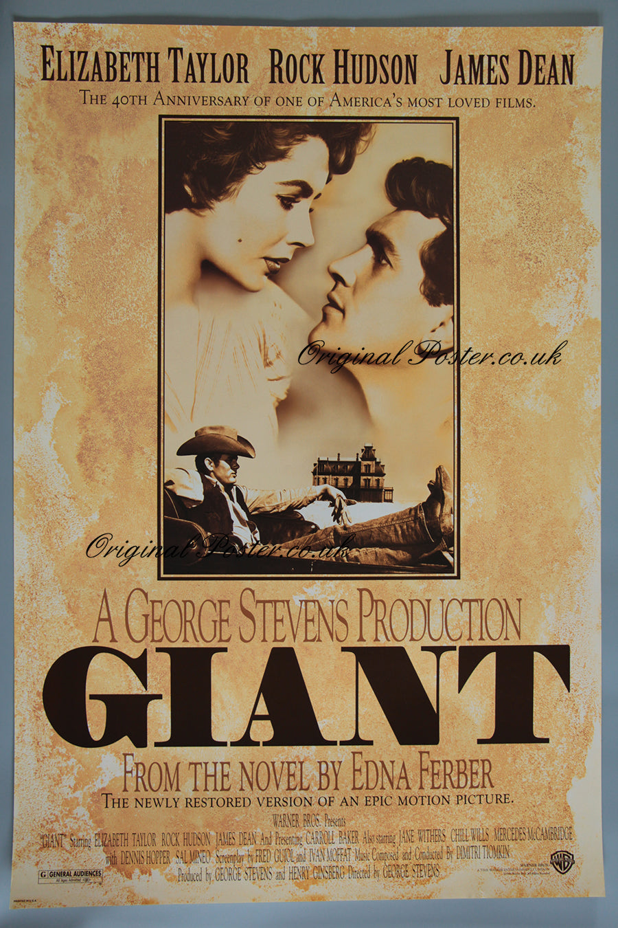 Classy double-sided film poster produced in limited quantities for use in the cinema lightbox to promote the 1996 fortieth year anniversary of James Dean's last film "Giant". James Dean is pictured in a great casual pose before his untimely death in a car crash. Elizabeth Taylor and Rock Hudson co-star in this epic drama when James Dean strikes oil and is set to become a film icon. Excellent rolled condition.