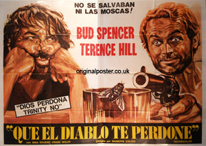 This very large Argentinian film poster features the artwork of Renato Casaro with the humouress situation of Terrence Hill about to shoot an unwelcome barfly. We get the feeling Casaro really enjoyed working on the comedy westerns and this situation is novel and comical.