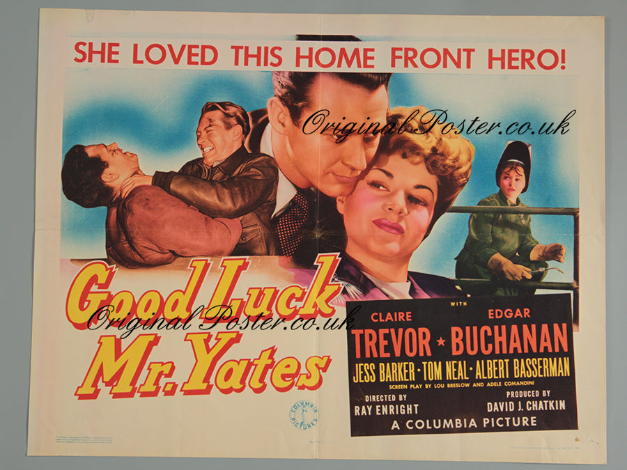 This Columbia Pictures film poster dates from 1943 picturing Claire Trevor and Edgar Buchanan "Good Luck Mr Yates" telling the story of women working to produce arms in factories in America and the love interest that this created with a few men that worked there. Great old Columbia Pictures logo on this folded film poster with great colours and no pinholes.