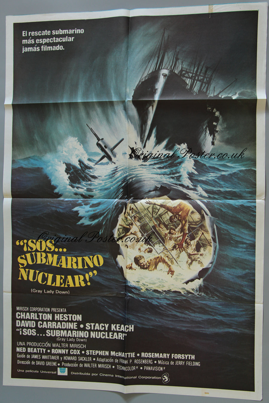 Charlton Heston is pictured as the Captain of the submarine "Gray Lady Down" in this 1978 disaster movie film poster. Folded condition as issued to the Spanish cinema.
