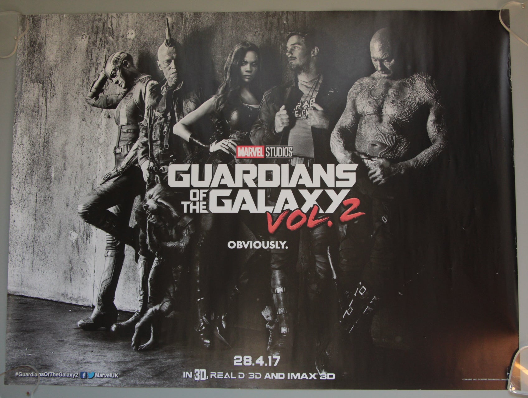 Original teaser UK Quad film poster for "Guardians of the Galaxy Vol. 2" in rolled double-sided condition from 2017. This is the sequel to the excellent Marvel superhero film set in space starring unlikely hero Peter Quill / Chris Pratt and his gang of loveable misfits. The black and white cast photo style artwork on this poster has a very cool look and the poster has an equally cool tagline "Obviously." This rolled cinema poster just has a 1 1/2 inch tear in the bottom right corner but displays very well.
