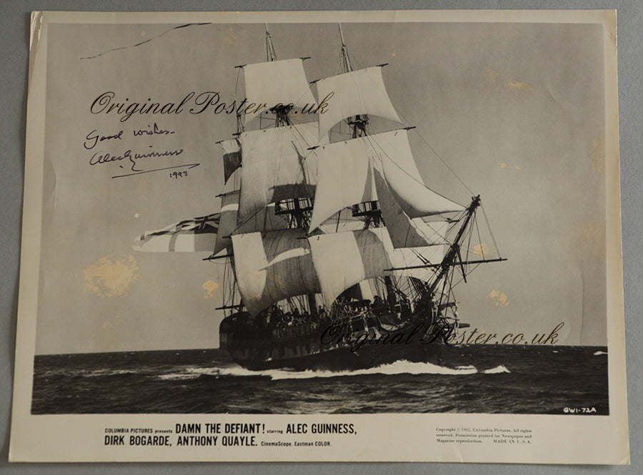 This British FOH cinema still with a fine photograph of HMS Defiant sates from 1962 and has been signed in 1993 "Good Wishes - Alec Guinness 1993" with a cheery wish.