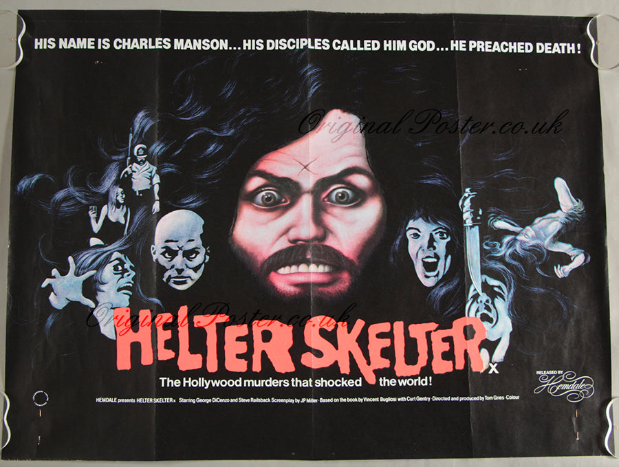Frightening X certificate 1976 first release British quad film poster for the film "Helter Skelter" based on the terrible true story of Charles Manson. Staple marks as seen, 3 vertical fold lines - will be sent rolled in a sturdy tube.