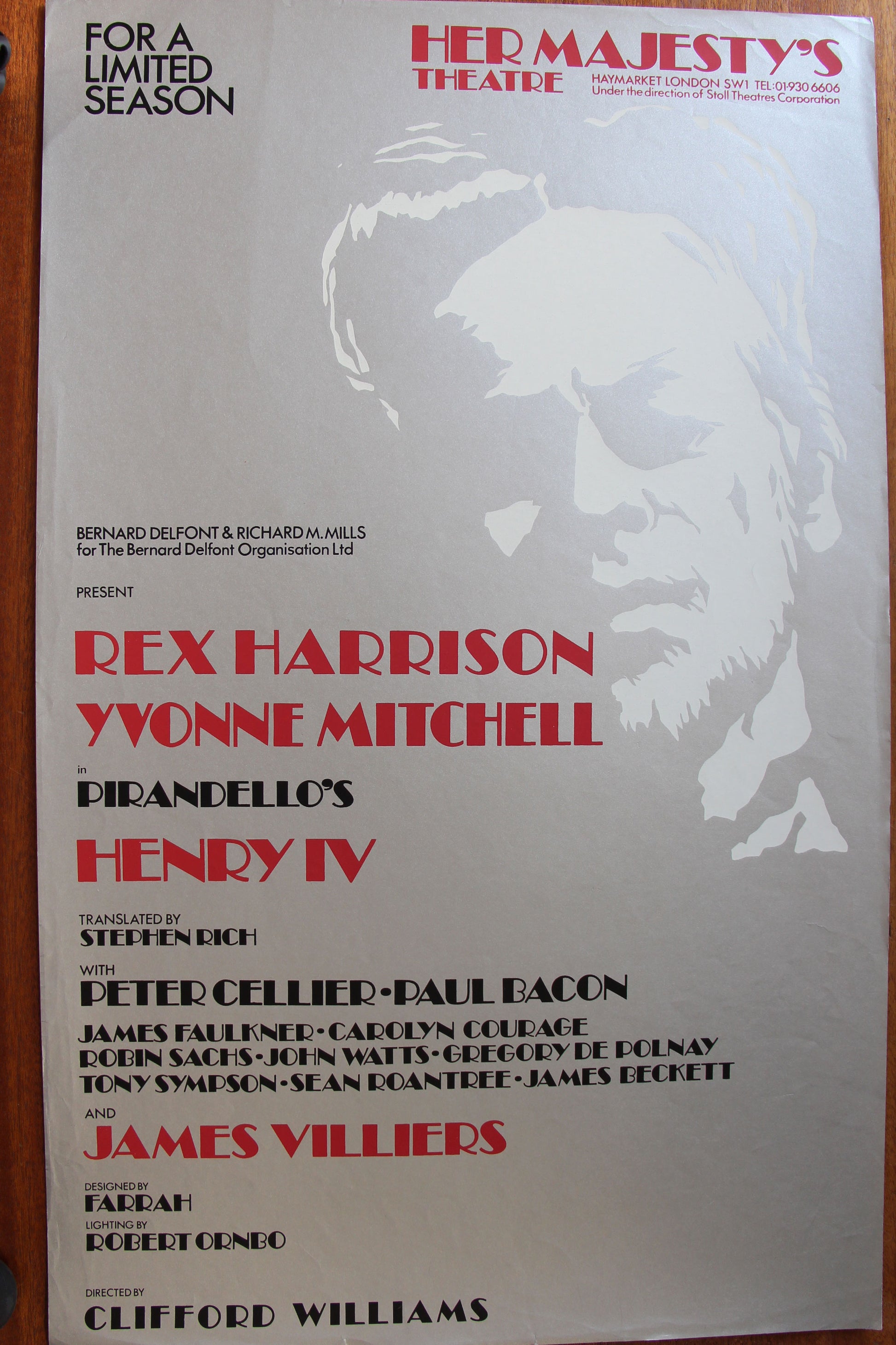 Rex Harrison is pictured as "Henry IV" in this excellent condition original rolled theatre playbill poster from his performance at Her Majesty's Theatre, Haymarket London.