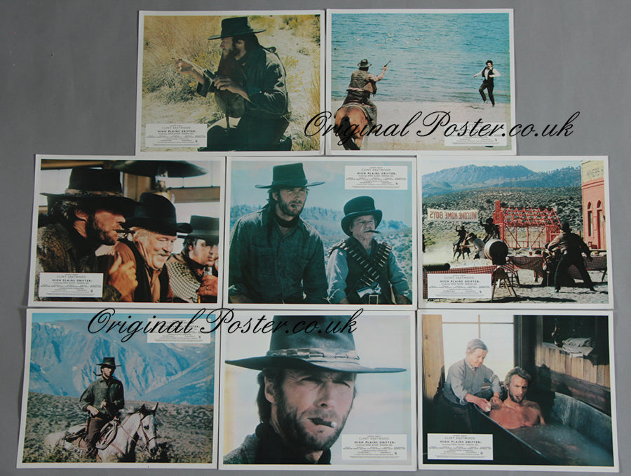 These 1973 cinema front of house lobby cards have fantastic photos of Clint Eastwood in classic poses he directs this Western starring as the Stranger. Excellent condition cards with no pinholes.