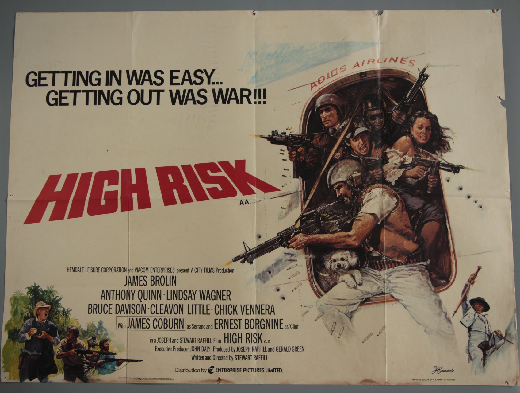 First release 1981 British quad film poster for the film "High Risk". The artwork features Anthony Quinn, James Brolin, James Coburn and Lindsay Wagner. The action adventure film artwork even pictures a happy looking dog on the airplane despite there being no door and the name "Adios Air Lines." Great artwork for a film with a sense of humour. Knicks on the top border which we have repaired with conservation tape to the reverse and a bit of browning as seen at the bottom border.