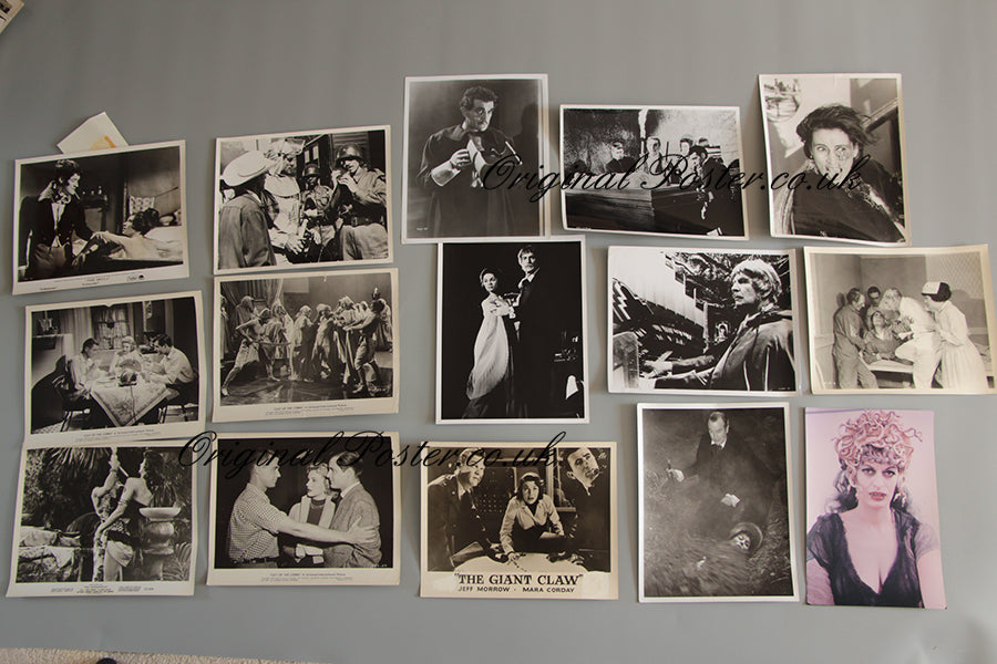 Horror stills including Boris Karloff in "The Invisible Ray", The Pit and the Pendulum, Vincent Price from "Dr Phibes Rises Again", Human Wreckage, Blood from the Mummy's Tomb, The Skull, The Giant Claw and others,