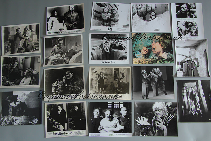 Horror stills inc The Giant Claw, Frankenstein 1970, The Mummy, To the Devil a Daughter, The Burning, Halloween, House of Whipcord, Nosferatu the Vampire, The Devil's Rain, The Savage Bees, They Live, and others.