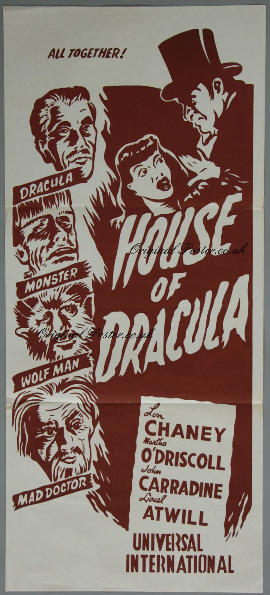 This 1960's film poster is a re-release for the original black and white 1945 film "House of Dracula". Universal Pictures copyrighted the famous make-up for the film and here we have pictures of Dracula, Frankestein's monster, the Wolf Man and the Mad Doctor. Great typography and a super picture of Martha O'Driscoll being threatened by Count Dracula. Excellent folded condition with no pinholes.