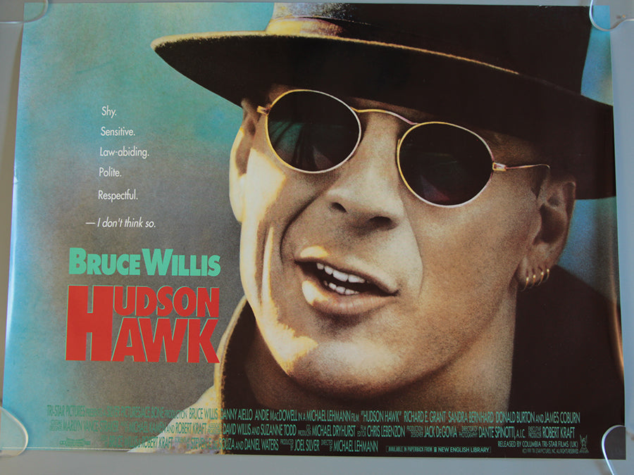 Bruce Willis is pictured here as the retired cat burglar persuaded to go back to crime. This is the rolled condition 1991 British quad fin poster as supplied to the cinema and with no pinholes. Bruce Willis is "Hudson Hawk".