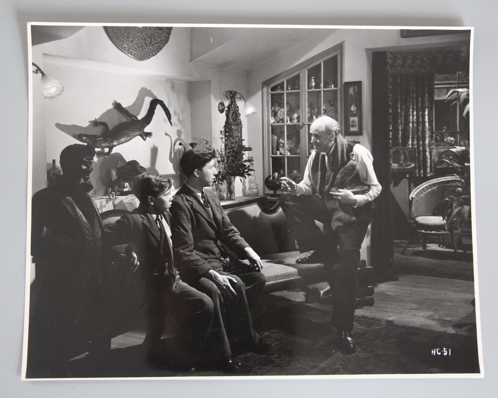 "Hue and Cry" is a very early Ealing comedy from the year 1947 and stamped on the reverse is "National Film Library" "National Film Archive preservation print" with a great still of a very hard to find key scene picturing Alistair Sim in the role of Felix H. Wilkinson. Alistair Sim plays the eccentric and reclusive author of a boys comic serial called "The Trump" and he has interactions with the "School boys" and is very worried that his work has been purloined by master criminals. He famously exclaims "Oh, How I loathe adventurous-minded boys!". Eventually, the boys convince him to help them. They arrange with him to write a specific new adventure story designed to trick the criminals into a trap at a specific "drop" location. Great still in good condition and with no pinholes.