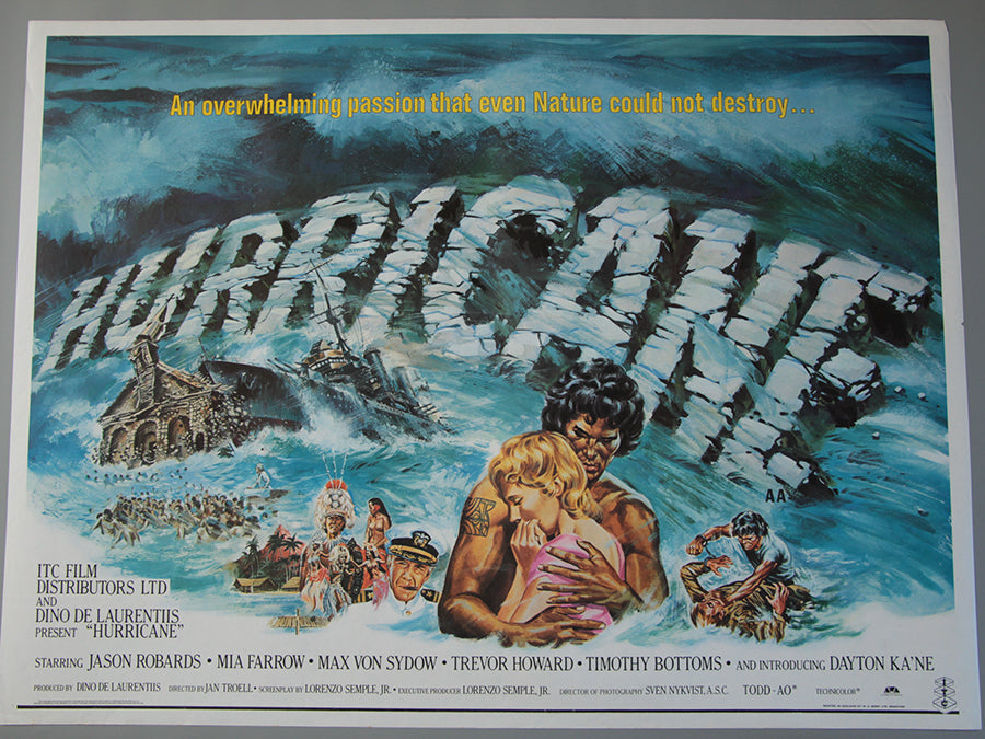 "Hurricane" first release British Quad film poster from 1979 with artwork by Tom Chantrell who painted the scenes around the island of Bora Bora where producer Dino De Laurentiis built the entire town of Pago Pago including a luxury hotel for the cast and crew. The artwork is highly detailed and in full colour with detailed painting of the islanders and Jason Robards and Mia Farrow. Printed in England by W.E. Berry of Bradford. Superb rolled condition having been taken from the printing press before the folding machine.