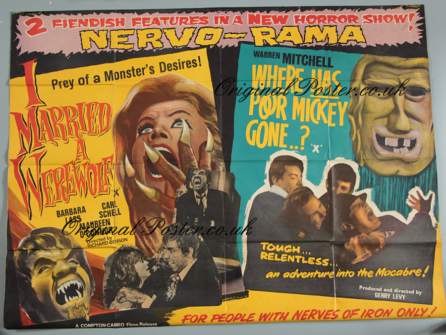This 1960's double-bill British quad film poster is billed as "NERVO-RAMA" and was released by Compton - Cameo Films. "I Married a Werewolf " was an 'X' certificate horror film made in 1961 and the film poster has the added benefit of the cinema manager having pasted two additional black and white scenes from the film.