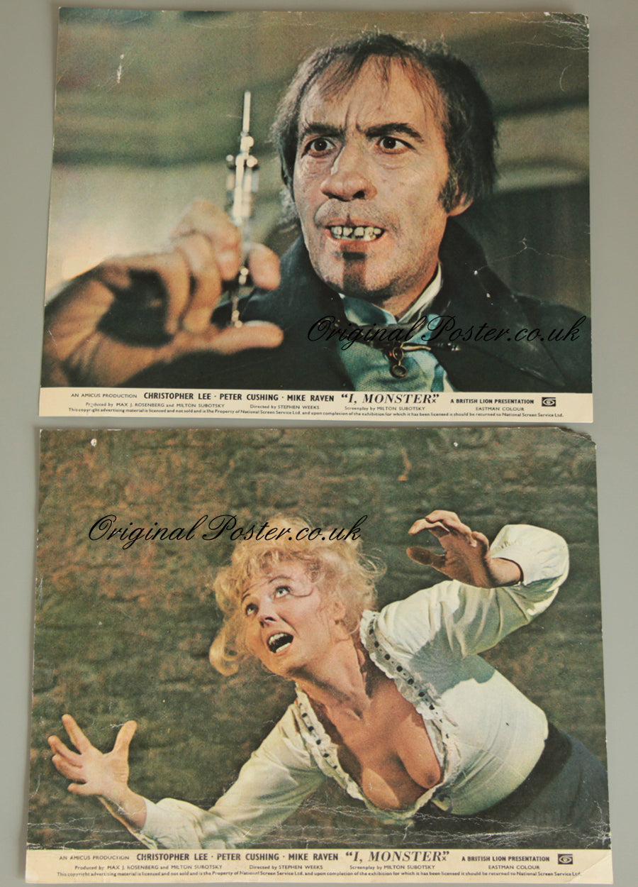 Two British Horror lobby cards for the 1971 film "I, Monster" picturing Christopher Lee as the monster with syringe in hand. Cards have crease marks as seen and one has a very light stain to reverse that does not show through to the front.