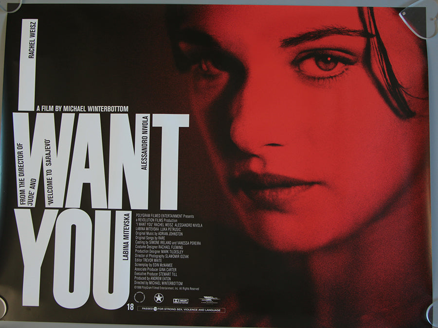Rachel Weisz is pictured as Helen in this 1998 British quad cinema poster "I Want You." The film poster was printed in limited numbers for use in the lightbox and is as issued to the cinema in rolled condition with no pinholes.