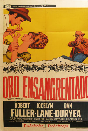 Robert Fuller from the tv show "Laramie" stars opposite veteran baddie Dan Duryea. We have stolen gold, Apaches in warpaint, technicolour and vibrant colours on this Argentinian poster to match.